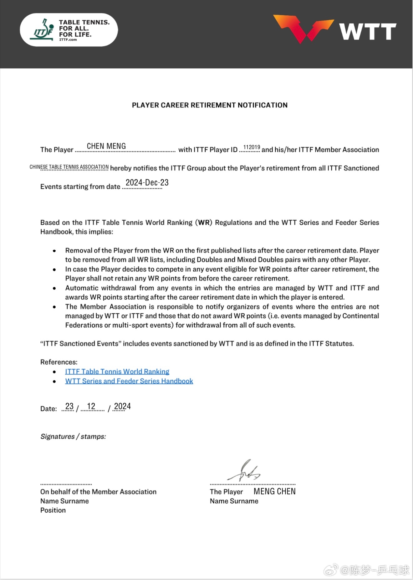 12月27日,樊振东宣布退出WTT世界排名。几个小时后,陈梦也通过微博宣布退出。