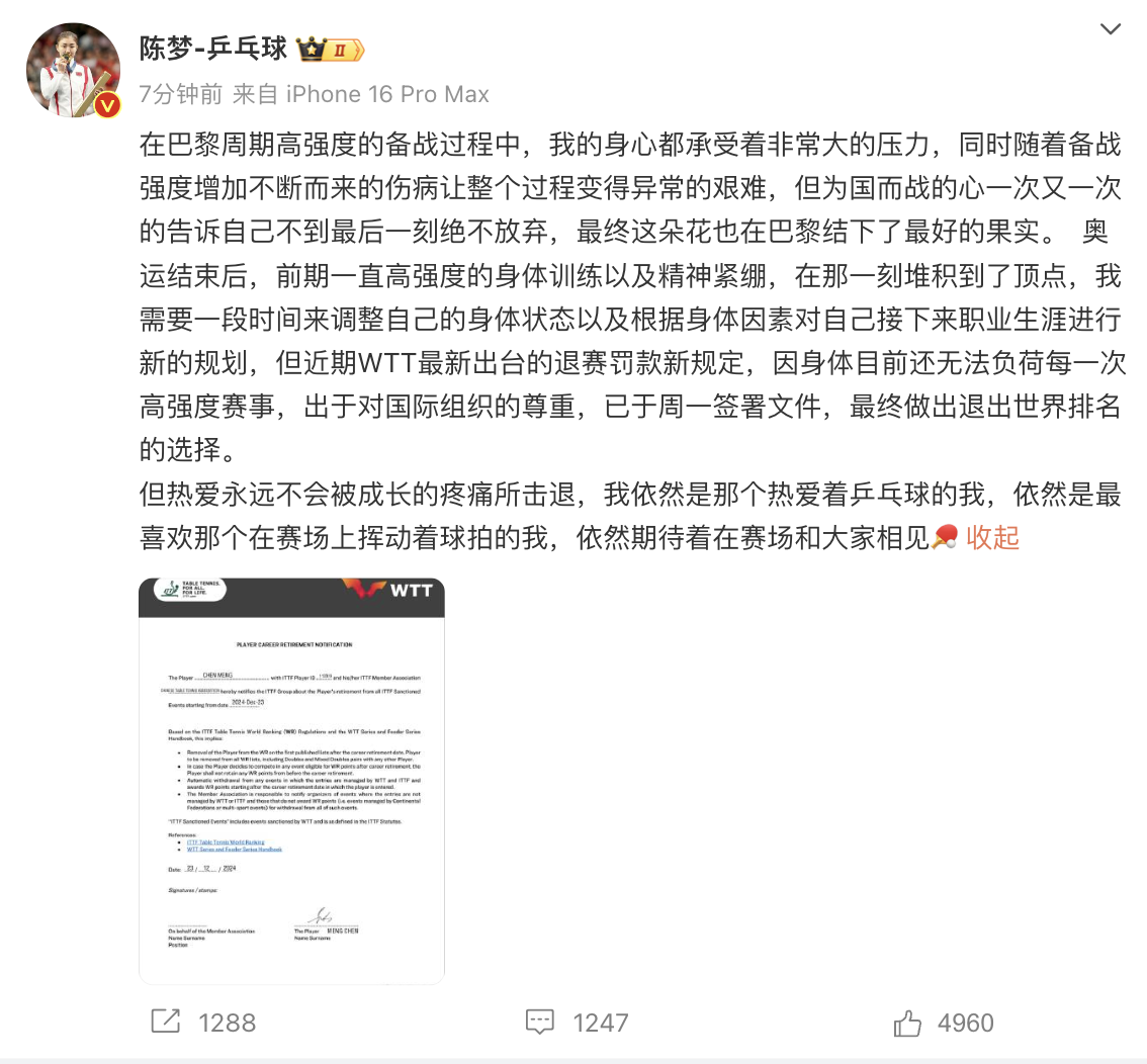 在巴黎周期高强度的备战过程中,我的身心都承受着非常大的压力,同时随着备战强度增加不断而来的伤病让整个过程变得异常的艰难,但为国而战的心一次又一次的告诉自己不到最后一刻绝不放弃,最终这朵花也在巴黎结下了最好的果实。奥运结束后,前期一直高强度的身体训练以及精神紧绷,在那一刻堆积到了顶点,我需要一段时间来调整自己的身体状态以及根据身体因素对自己接下来职业生涯进行新的规划,但近期WTT最新出台的退赛罚款新规定,因身体目前还无法负荷每一次高强度赛事,出于对国际组织的尊重,已于周一签署文件,最终做出退出世界排名的选择。