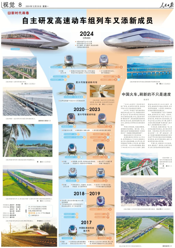 2007年,“和谐号”动车组运营时速超200公里;2017年,中国标准动车组“复兴号”在全世界率先实现时速350公里商业运营;今天,CR450动车组“横空出世”,将我国高铁试验时速提升至450公里,运营时速提升至400公里,这将是全世界商业运营的最快速度。