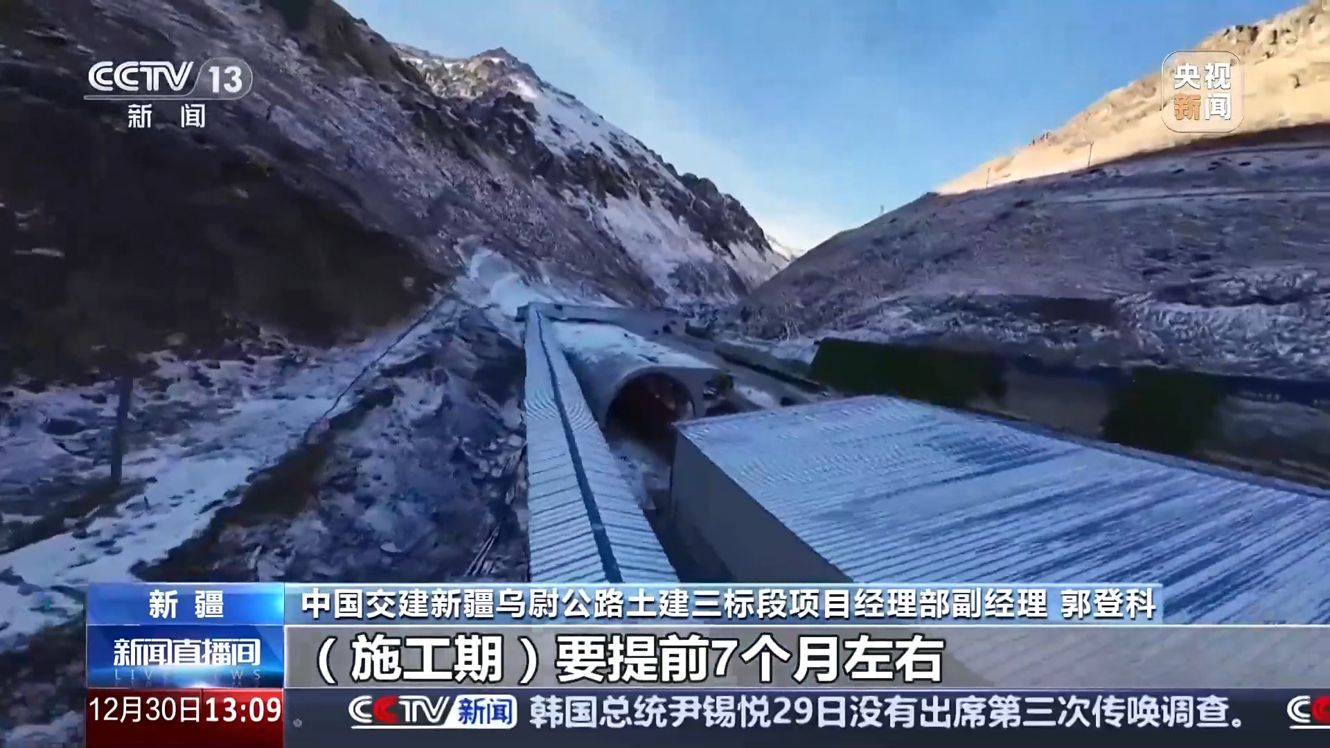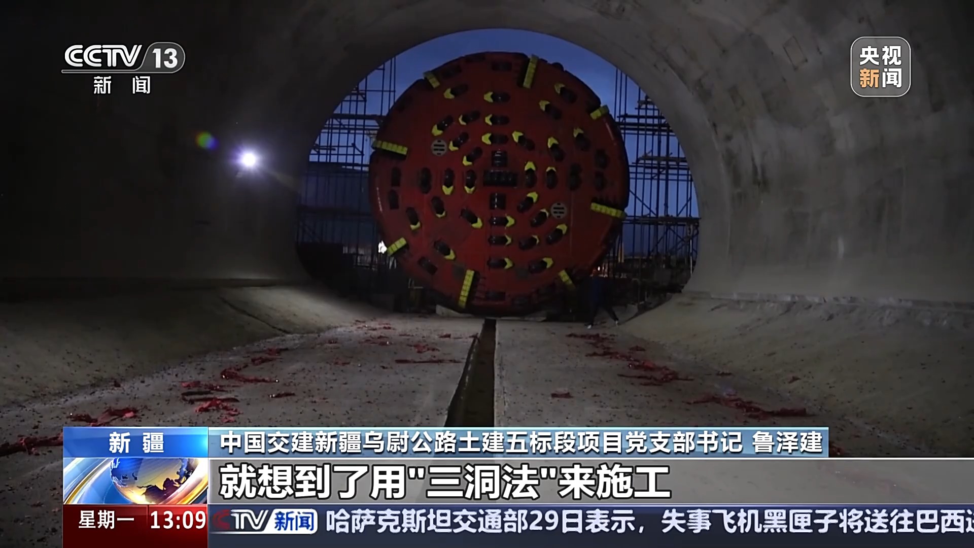 中国交建新疆乌尉公路土建五标段项目党支部书记 鲁泽建:为了早日贯通这个隧道,然后前期建设人员跟设计人员就想到了用“三洞法”来施工。所谓的“三洞法”,它就是用中导洞用TBM(硬岩掘进机)来施工,因为TBM它的掘进速度是人工钻爆的三到五倍,让它先行,再利用横通道把主洞分成若干个小洞来增加工作面,实现长隧短打,这样的话我们4年多就全部贯通了,完成了。