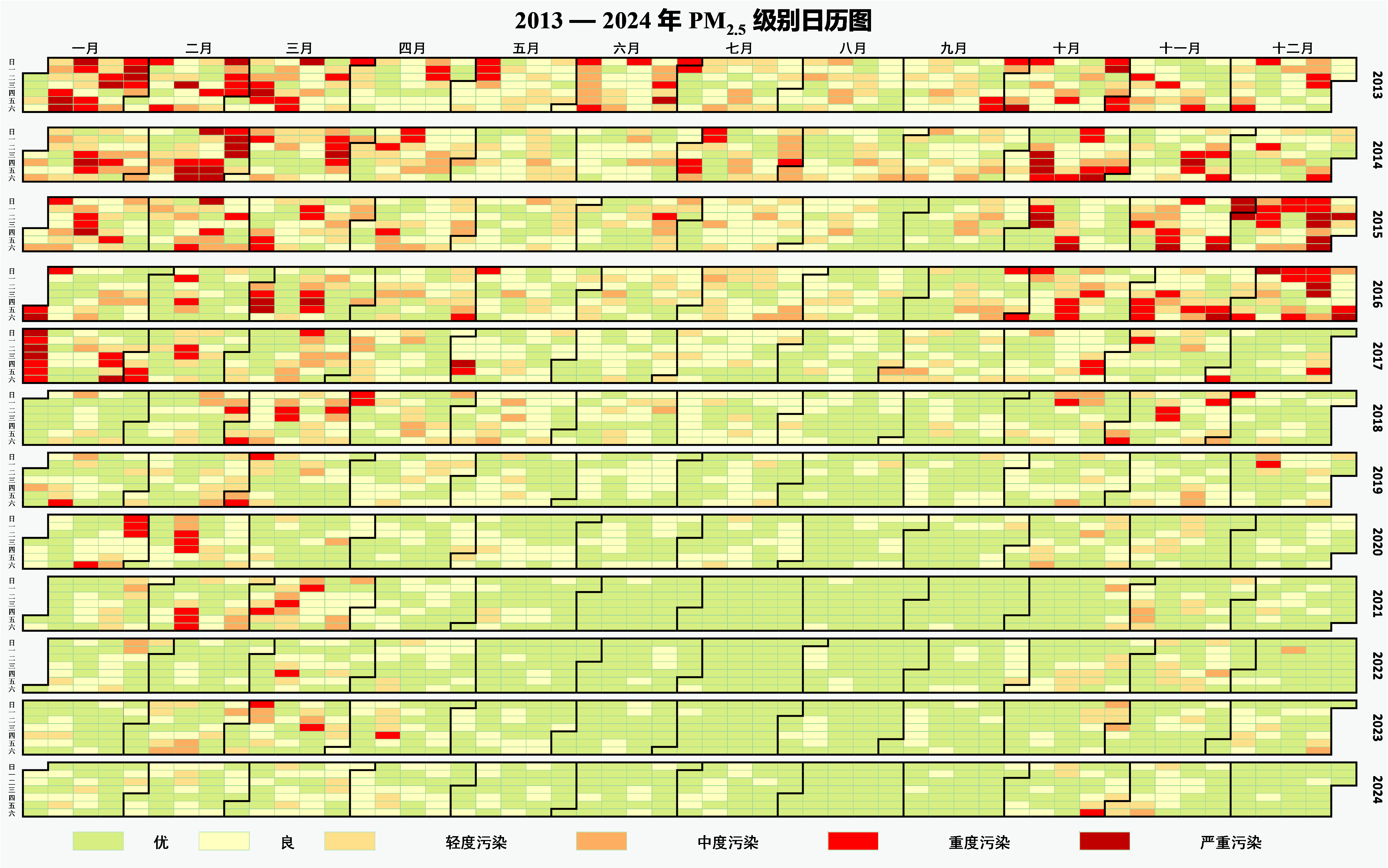 和“北京蓝”关系最为密切的指标是PM2.5。会上,北京市生态环境监测中心主任沈秀娥展示了一张跨度达12年的PM2.5级别日历图,记录了从2013年到2024年北京市每一天的PM2.5级别情况。可以直观地看到,日历图上代表不同PM2.5级别的色系,呈现出从“五颜六色”到“绿意盎然”的变化趋势,客观反映了北京市空气质量改善的历程。