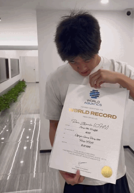 潘展乐收到世界纪录证书 “这有什么介绍的,第二个了”