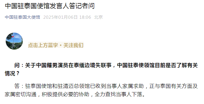 中国籍男演员在泰缅边境失联,中国驻泰国使馆回应