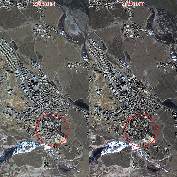 △西藏日喀则市定日县及周边地震受灾前后光学卫星图像(灾前:资源三号03星2025年1月4日采集,灾后:高分一号03卫星2025年1月7日采集)