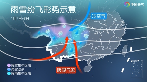 其中,贵州北部、重庆东南部、湖北西南部、湖南西北部的降雪主要在8日晚至9日上午时段,上述大部地区从8日夜间到9日凌晨陆续转雪,降雪基本会持续至9日上午,但9日午后开始,部分地区由于气温回升可能由雪再转雨。
