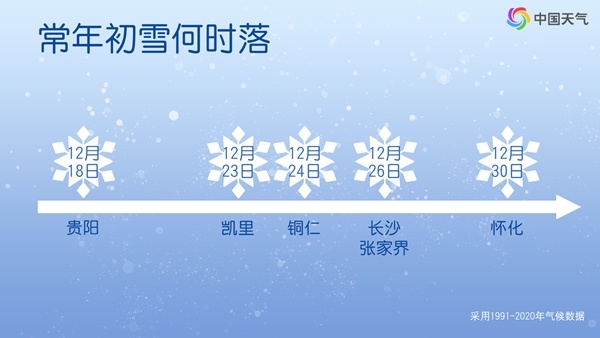 具体来看,贵州贵阳、凯里、铜仁,湖南长沙、怀化、吉首、张家界都有机会见到今冬“迟到”的初雪。