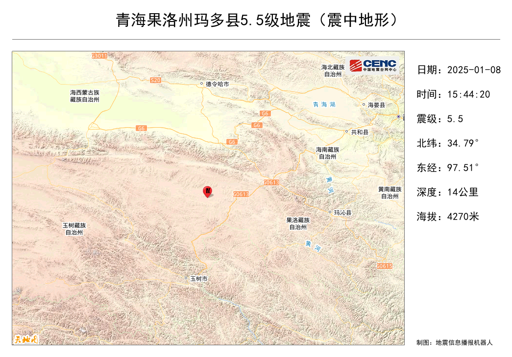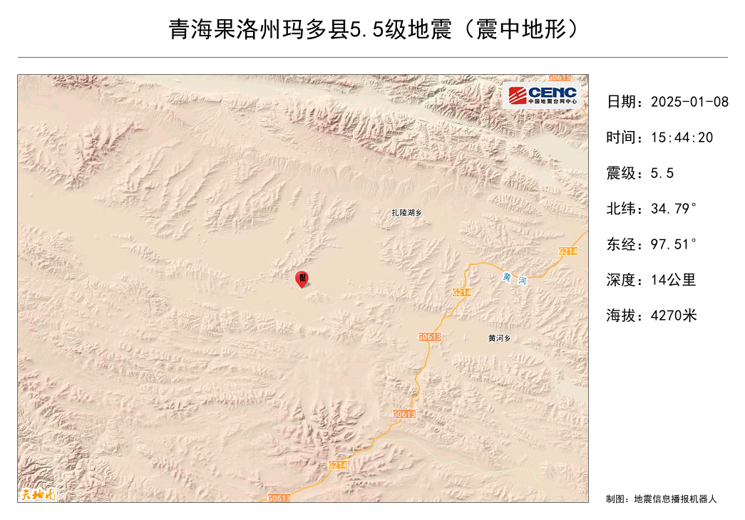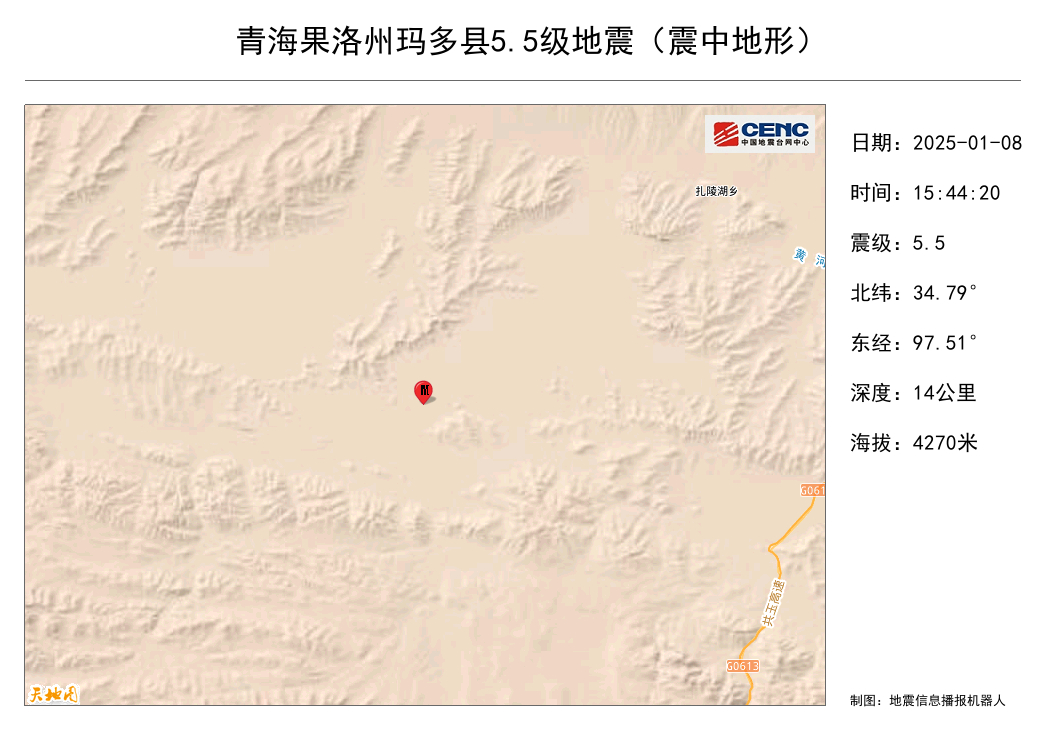 中国地震台网正式测定:01月08日15时44分在青海果洛州玛多县(北纬34.79度,东经97.51度)发生5.5级地震,震源深度14千米。