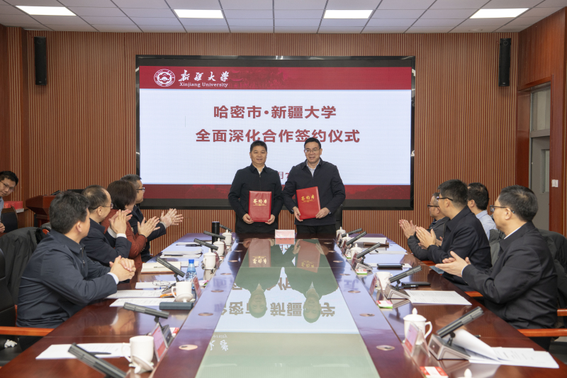 哈密市政府党组成员、副市长胡冬明与新疆大学党委常委、副校长粟智代表双方签订《哈密市人民政府新疆大学全面深化合作协议》。