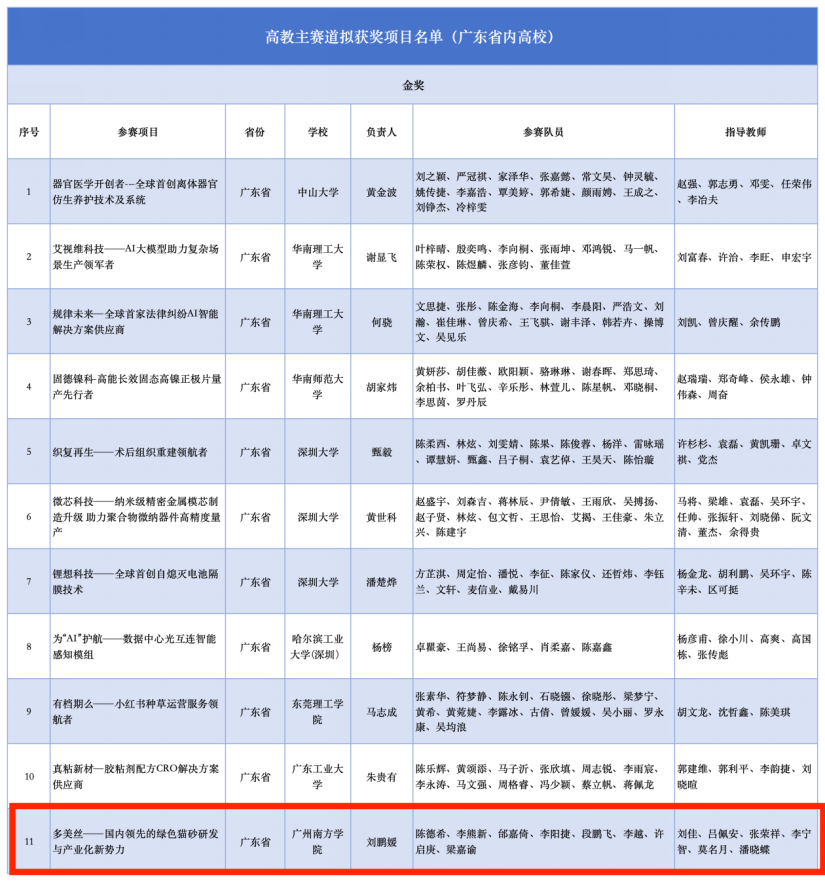 近日,教育部公布中国国际大学生创新大赛(2024)获奖名单。广州南方学院参赛项目“多美丝——国内领先的绿色猫砂研发与产业化新势力”在全球514万个项目中脱颖而出,斩获高教主赛道金奖,实现了学校在该项赛事金奖“零”的突破,学校也因此成为广东省内唯一获此佳绩的民办高校。