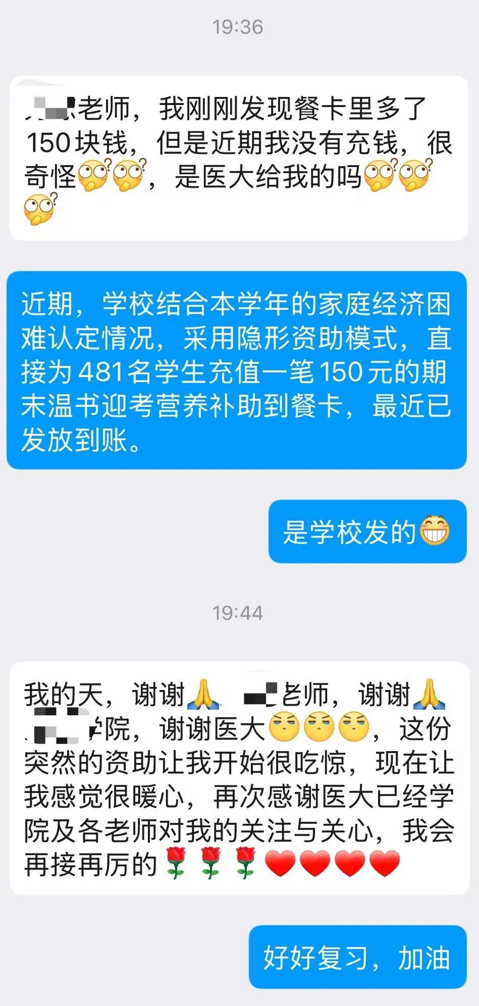 如何既保障学生的基本生活需要,又能助力学子在校园里安心求学,追逐梦想?福建医科大学在期末周特别为学生筹备了一份“期末能量补给”,根据学校学生家庭经济困难认定情况,采用“静悄悄”隐形资助模式,无需申请、无需审核,直接为481名学生每人充值一笔150元的营养补助到餐卡。