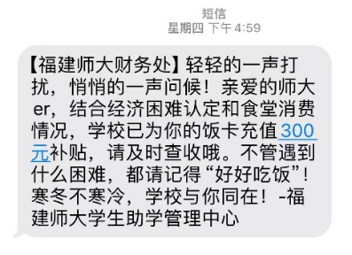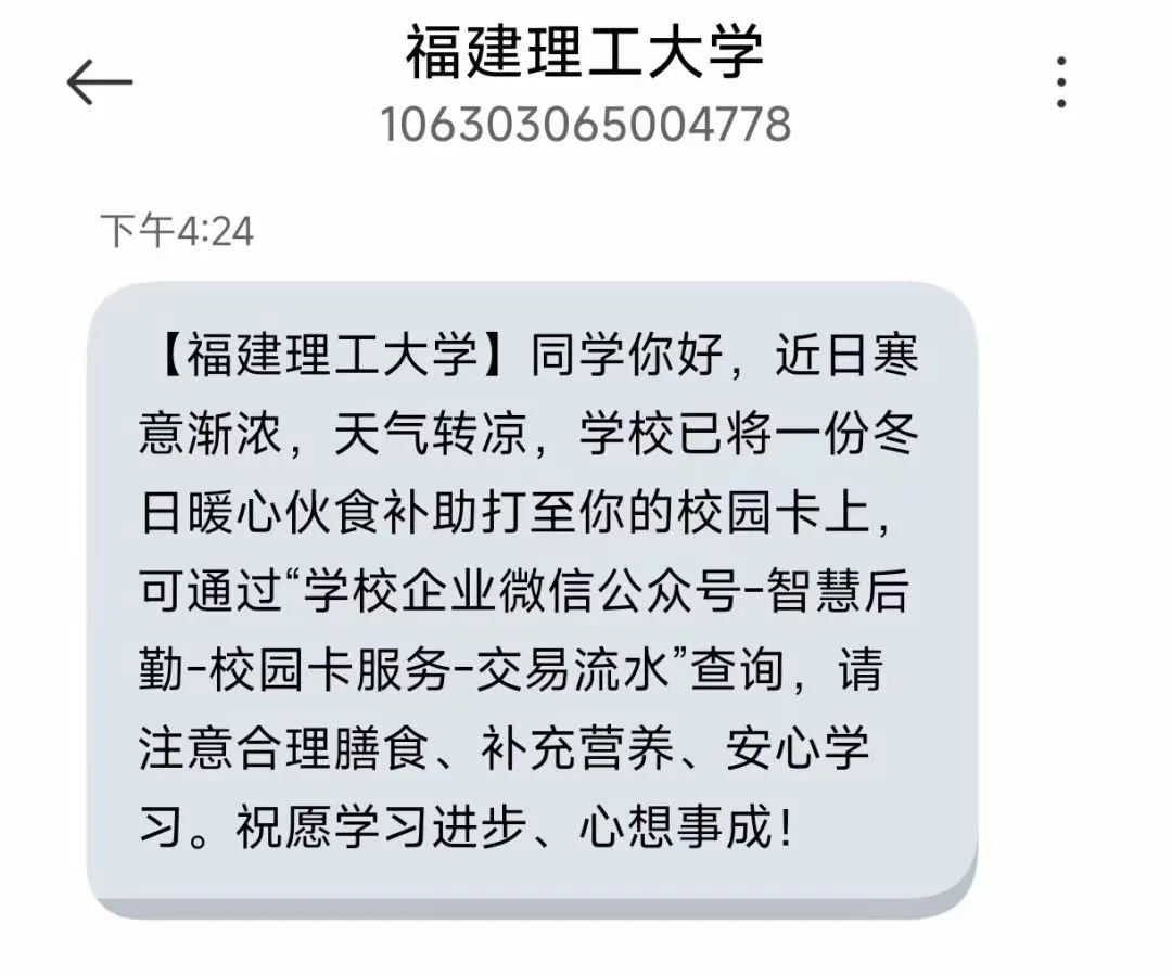 “我们将补助直接打入学生校园卡中,并通过短信方式提醒学生查收并注意补充营养。这种资助方式既保护了学生的个人隐私,同时也照顾到了他们的自尊心。”记者从福建理工大学获悉,今年学校首次开展“冬日暖心饭卡”行动,无需学生申请、不用审核、悄悄发放又精准到位,已补助2000多名学生,累计补助17.88万元。