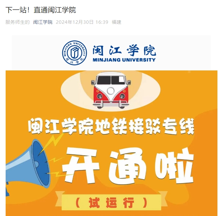 “为方便学子返乡归家,今年1月1日起,闽江学院地铁接驳专线(试运行)正式开通,从学校南门即可直达地铁口的公交站,中途不停靠,‘一站式’接驳。同时,学校还开通了到福州长乐机场的寒假返乡临时专线,学生可在校门口以八折优惠乘车前往机场。”闽江学院学生资助管理中心柳晓芬老师接受记者采访时这样表示。学校还面向家庭经济困难学生发放返乡补助,省内学生每人200元,省外学生每人800元。