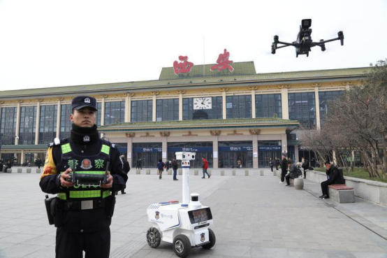 警务机器人+无人机现身西安站广场,打造“空地一体”的智慧巡防模式。