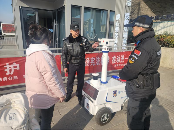 “欢迎各位旅客来到古城西安,我是巡逻机器人‘暖暖’,公安站前分局提醒您,车站人多拥挤,请大家保管好随身财物,如果需报警求助可找我协助。”9日上午,在西安站南广场这台警务机器人“暖暖”正按照既定路线,与民警默契配合开展巡逻工作。途经广场以东的休息区域,发现旅客较为集中时,“暖暖”立即停了下来,向旅客播放安全提醒、反诈宣传,提醒大家看好行李物品,警惕电信诈骗守好钱袋子。