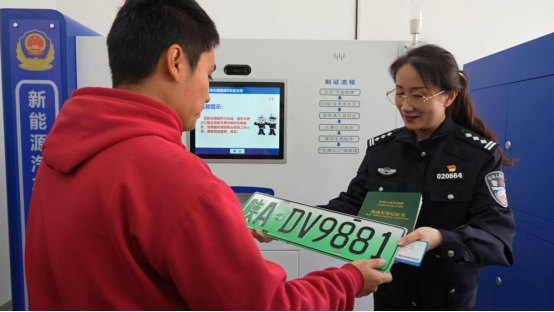 车管所东区分所所长贾茹(右)为市民递上刚自动智能号牌制作机刚制作完成的新能源号牌。