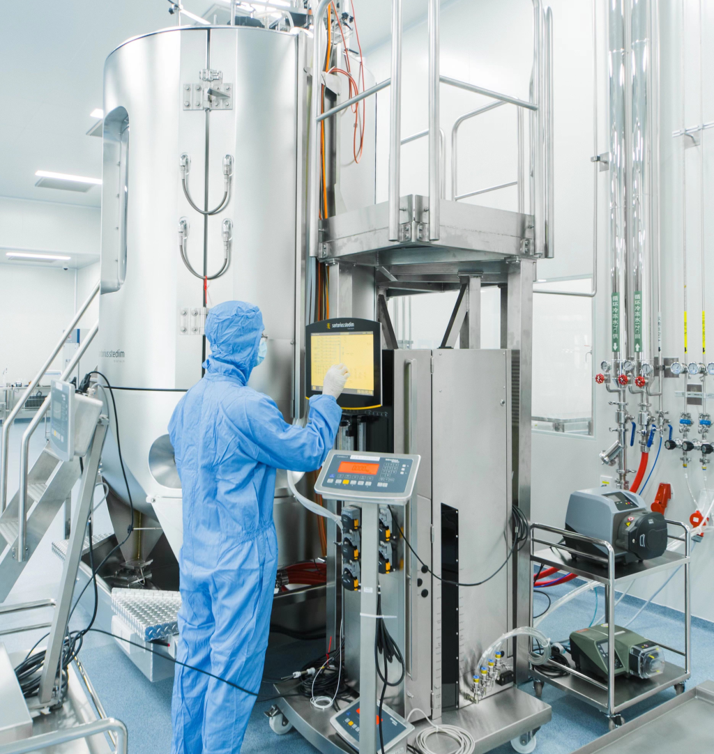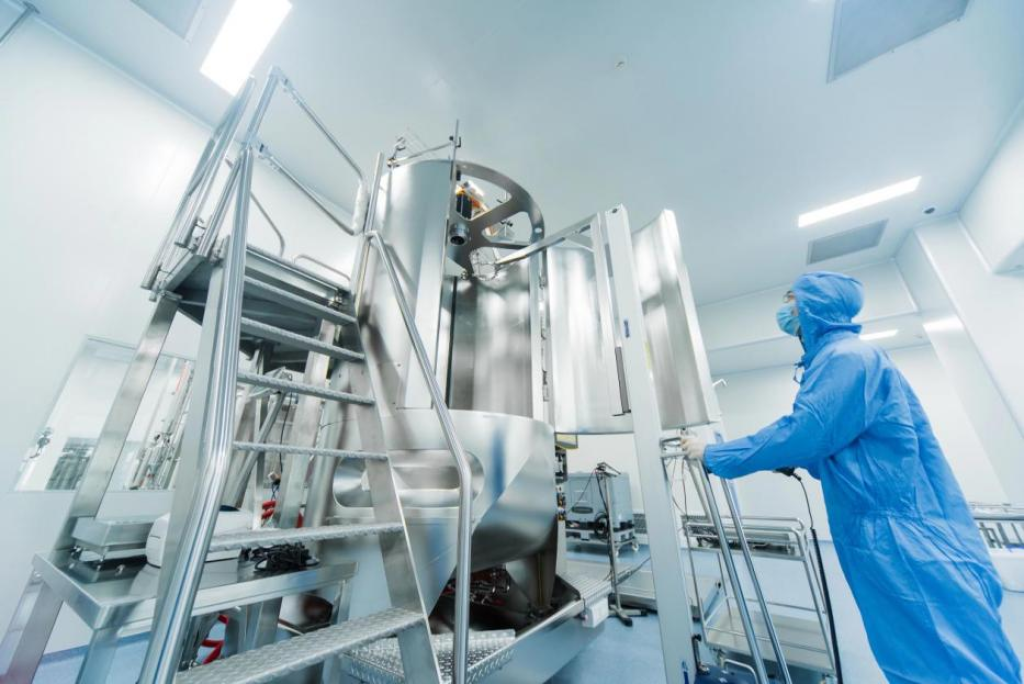 在无菌环境下,工人将原料药投放入容器中。科伦集团供图