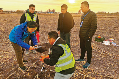 徐爱国(左一)指导作业队土壤采样流程规范。 |