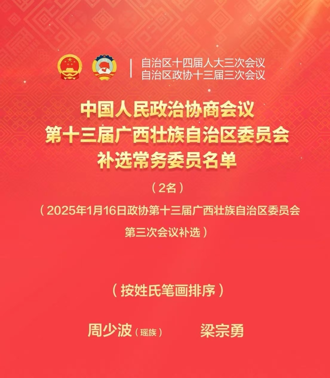 1月16日上午,中国人民政治协商会议第十三届广西壮族自治区委员会发布补选常务委员名单,周少波(瑶族)、梁宗勇补选为