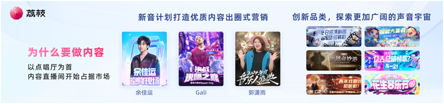 赛事活动上,荔枝通过与知名音乐人、厂牌合作推动音乐内容发展,聘请专业音乐人作为评委提供指导,打造声音互动中的流行乐、说唱等不同品类赛事玩法,培养出了一众有潜力、有音乐内容供给能力的优秀原创主播。