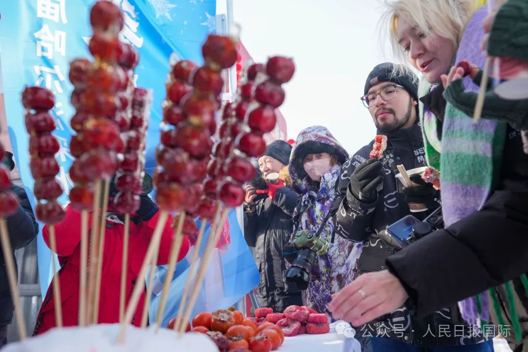 2024年12月7日,外国游客在第五届哈尔滨采冰节现场品尝冻货。 新华社记者王建威摄
