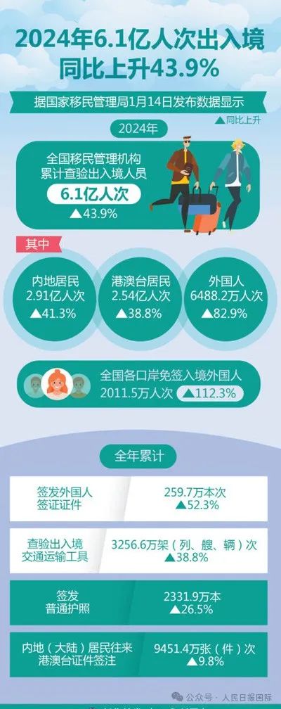 在2024年中国国际传播年度热词榜上,“中国游”一词名列前十。中国全面放宽优化免签政策,推出一系列便利外国人来华政策举措,“中国游”成为越来越多外国游客的优先选择。中国国家移民管理局最新数据显示,2024年,全国移民管理机构累计查验出入境人员6.1亿人次,同比上升43.9%;其中内地居民2.91亿人次、港澳台居民2.54亿人次、外国人6488.2万人次,同比分别上升41.3%、38.8%、82.9%。全国各口岸免签入境外国人2011.5万人次,同比上升112.3%。说走就走的“中国游”打开了世界了解中国的新窗口、新通道,向全球展现真实、多元和活力满满的中国形象。