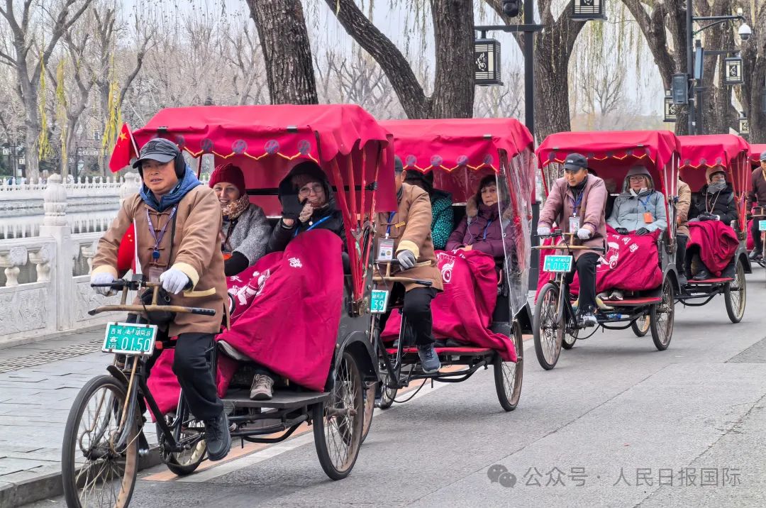 2024年12月12日,外国游客在北京什刹海乘坐人力三轮车观光。新华社记者鞠焕宗摄