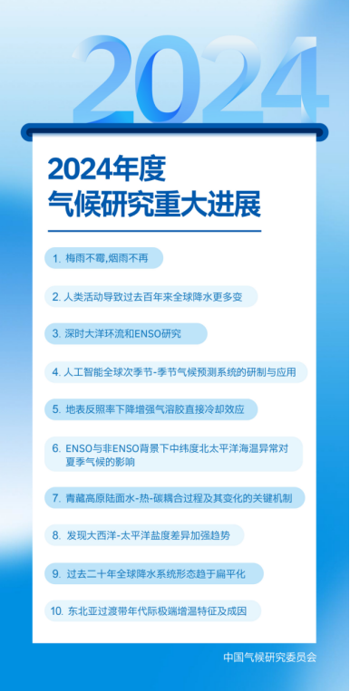 1月15日,由中国气候研究委员会主办的2024中国气候研究重大进展发布在南京信息工程大学举行。此次发布的10项气候研究重大进展,涵盖气候预测、气候变化影响、气候系统演变等多个领域。具体包括:“梅雨不霉,烟雨不再”、人类活动导致过去百年来全球降水更多变、深时大洋环流和ENSO研究、人工智能全球次季节-季节气候预测系统的研制与应用、地表反照率下降增强气溶胶直接冷却效应、ENSO与非ENSO背景下中纬度北太平洋海温异常对夏季气候的影响、青藏高原陆面水-热-碳耦合过程及其变化的关键机制、发现大西洋-太平洋盐度差异加强趋势、过去二十年全球降水系统形态趋于扁平化、东北亚过渡带年代际极端增温特征及成因。