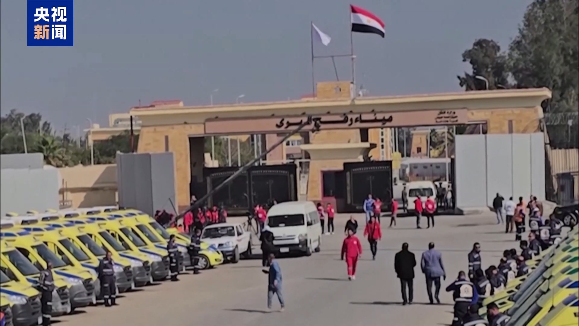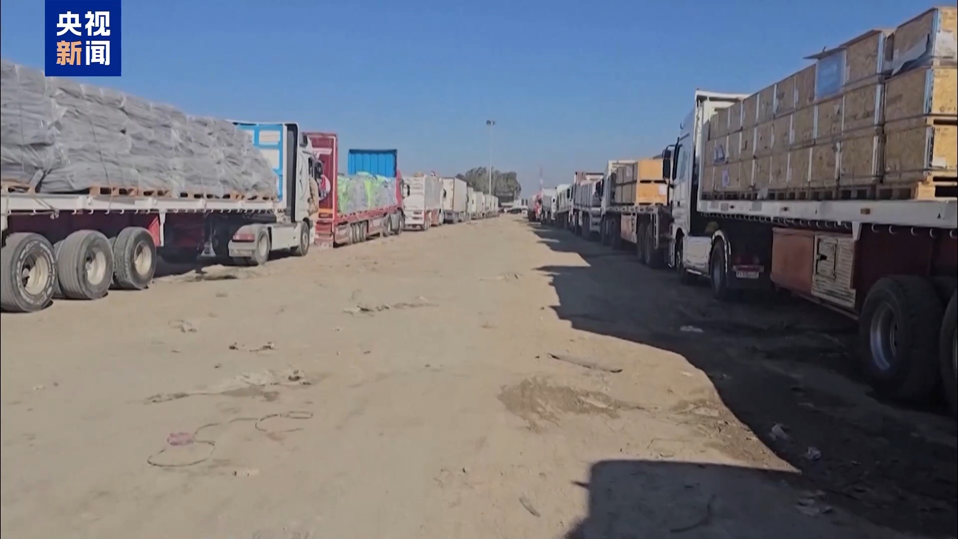 当地时间18日,在拉法口岸埃及一侧,大量载有人道主义援助物资的卡车等待停火生效后进入加沙地带。有司机表示,希望拉法口岸能够顺利开放。