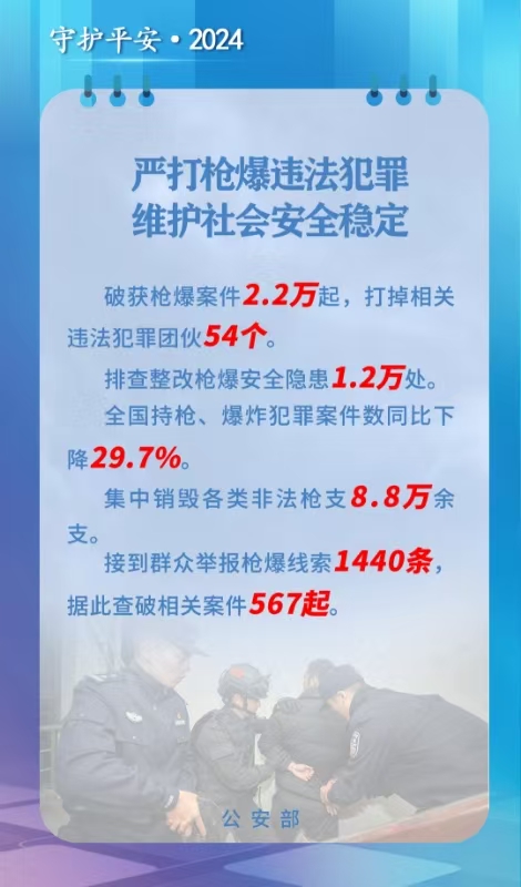 2024年,公安机关深入开展打击整治枪爆违法犯罪专项行动,社会面非法枪爆物品大幅压减,持枪、爆炸犯罪案件持续下降,有力维护了社会安全稳定,提升了人民群众安全感。