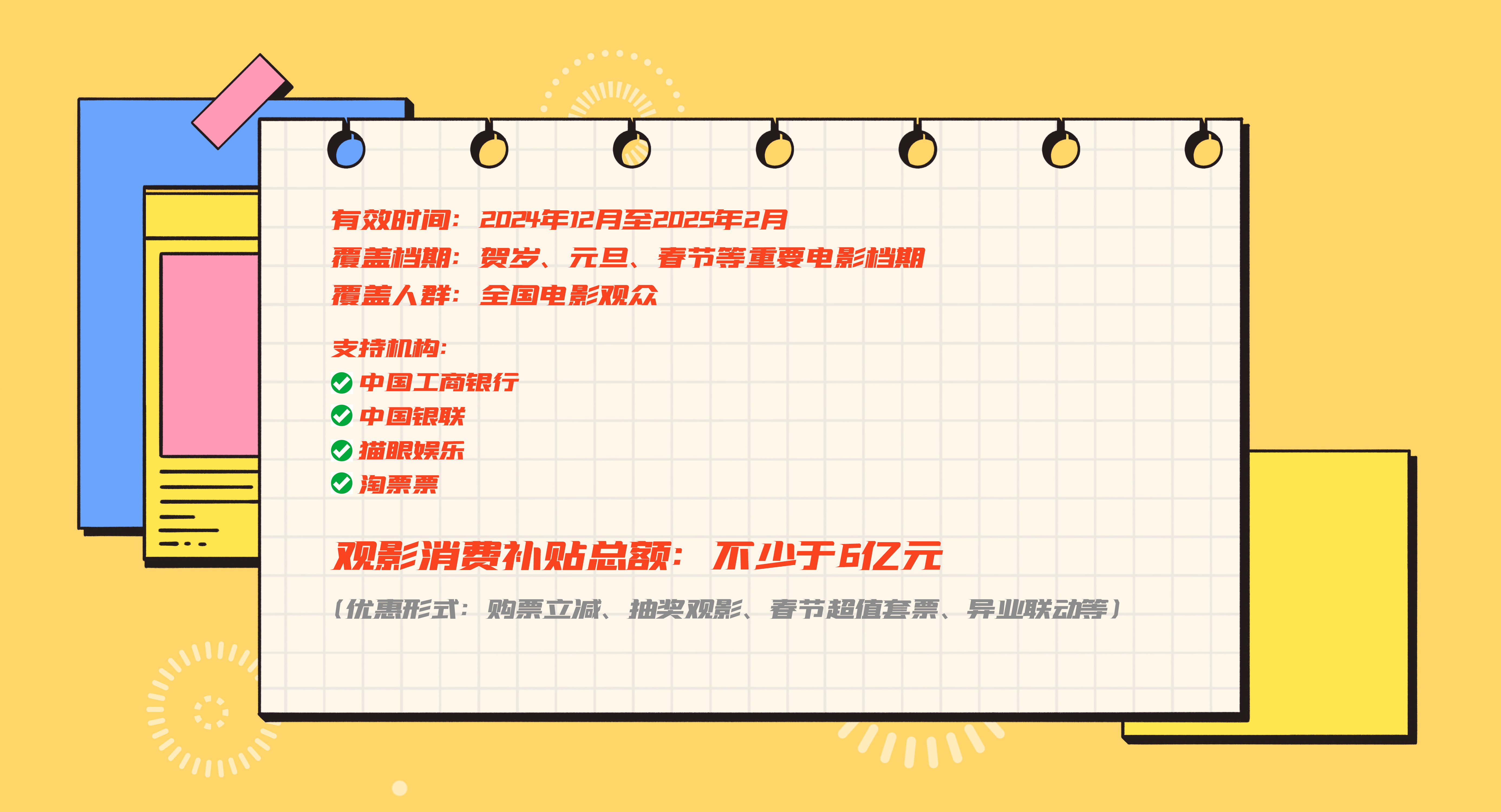 2024年12月9日至2025年2月28日,用户可通过淘票票App、微信淘票票小程序、支付宝淘票票小程序、淘宝淘票票小程序首页“全国电影惠民消费季”或“政府补贴”进入活动专题页领取5—50元红包,并且同时可享受淘票票买一赠一、淘麦VIP积分礼包、88VIP全年观影优惠券、影迷月活动。