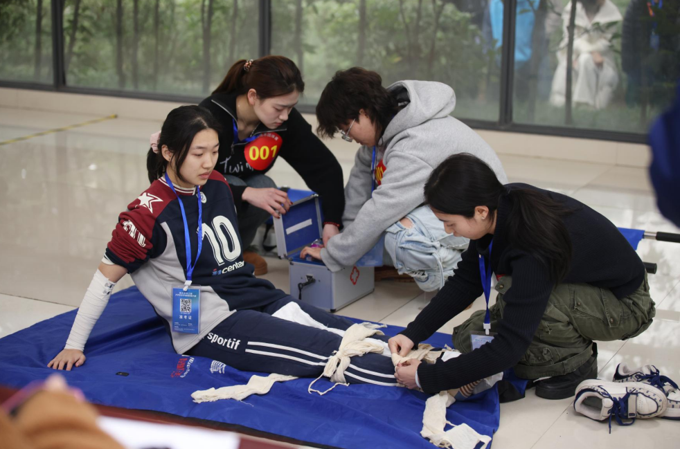 在急救技术比赛现场,4人一组的团队轮流上场,一人扮演多处受伤的伤者,其余队员为其止血、清创、固定和包扎。