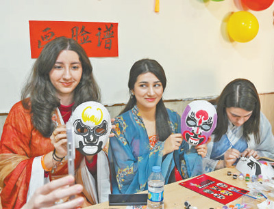 伊拉克萨拉赫丁大学学生在该校中文系举办的春节文化交流活动上展示绘制的脸谱。 |
