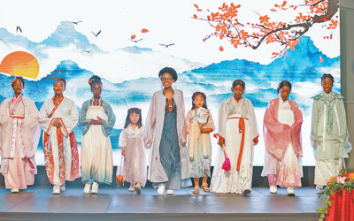 南非德班理工大学孔子学院学生在春节庆祝活动上表演汉服秀。 |