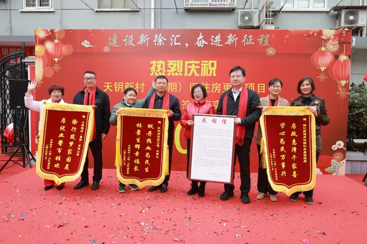 项目生效仪式现场喜气洋洋,天钥六期居民代表向徐汇区委、区政府送出感谢信,并向区住房保障和房屋管理局,枫林街道党工委、办事处,上海徐房(集团)有限公司分别送上锦旗。