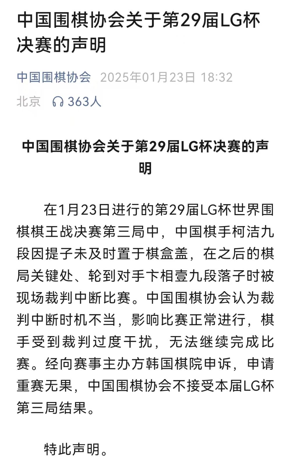 中国围棋协会随后在声明中表示:“棋手受到裁判过度干扰,无法继续完成比赛。”“经向赛事主办方韩国棋院申诉,申请重赛无果,中国围棋协会不接受本届LG杯第三局结果。”