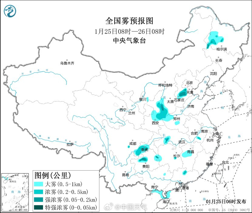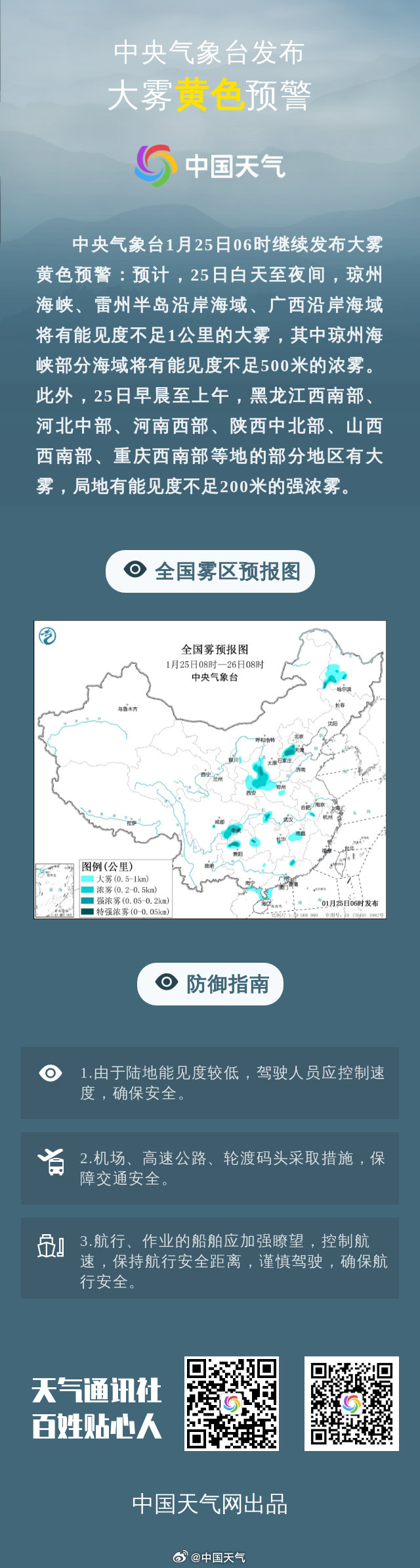 大雾→25日早晨至上午,黑龙江西南部、河北中部、河南西部、陕西中北部、山西西南部、重庆西南部等地的部分地区有大雾。