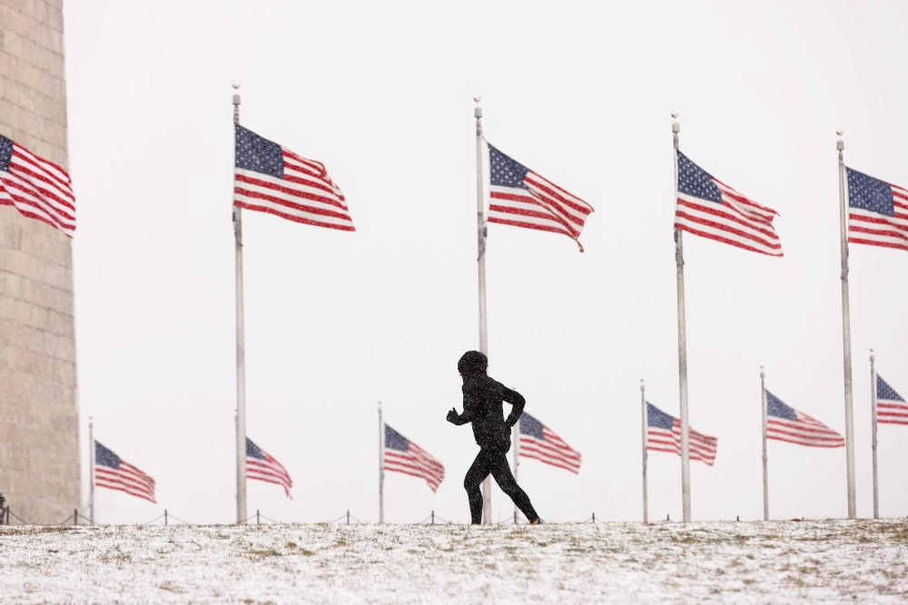 2024年1月15日,在美国首都华盛顿,一名男子冒雪在国家广场跑步。新华社发(阿伦摄)