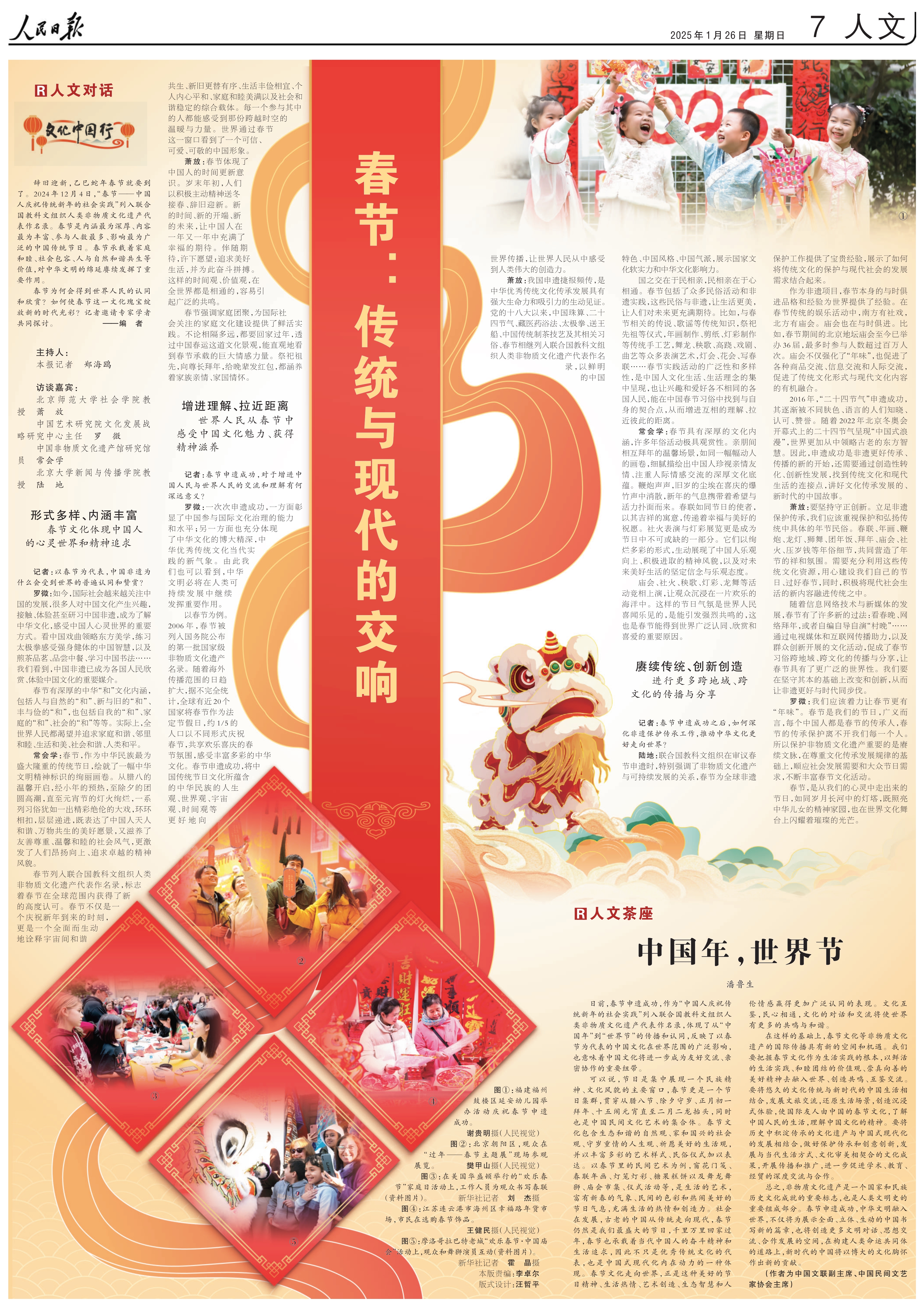 萧放:春节体现了中国人的时间更新意识。岁末年初,人们以积极主动精神送冬接春、辞旧迎新。新的时间、新的开端、新的未来,让中国人在一年又一年中充满了幸福的期待。伴随期待,许下愿望:追求美好生活,并为此奋斗拼搏。这样的时间观、价值观,在全世界都是相通的,容易引起广泛的共鸣。