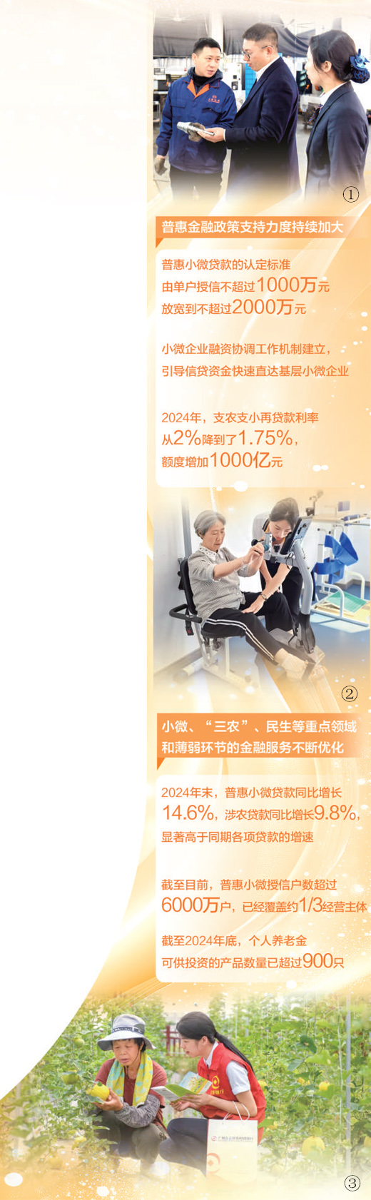 做好金融工作,必须坚持以人民为中心的价值取向。2024年,我国普惠金融支持政策加大力度,服务体系不断完善,小微企业融资难、融资贵问题进一步缓解,支持乡村全面振兴的金融投入不断增加,更多金融产品和服务走进寻常百姓家。老百姓的“小日子”里蕴藏着普惠金融的大文章,岁末年初,记者探访各类经营主体,感受一单单生意、一场场丰收、一笔笔消费背后涌动的金融活水。