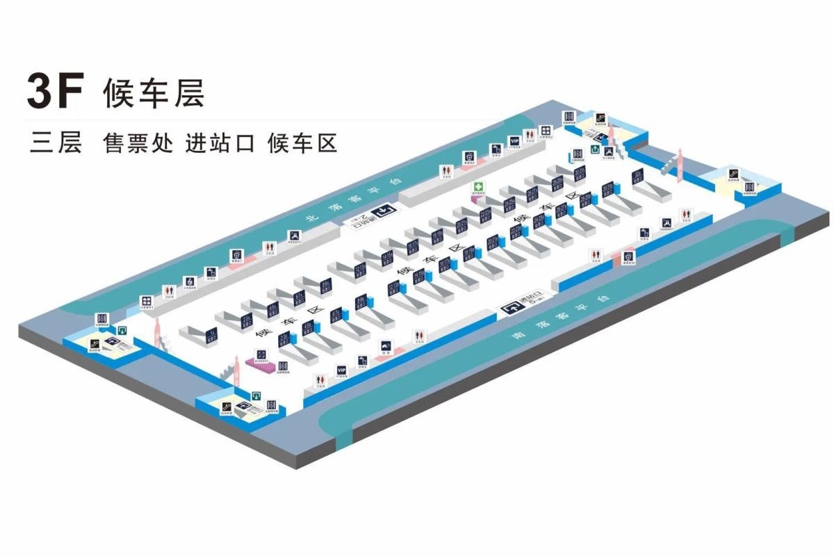 前往西南、南进站口的旅客可从地铁G口出站,搭乘站内西南角的电梯上至3楼。
