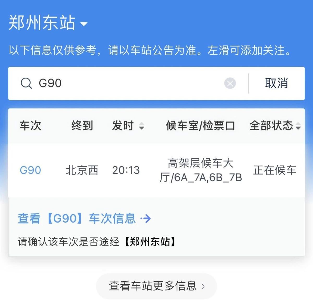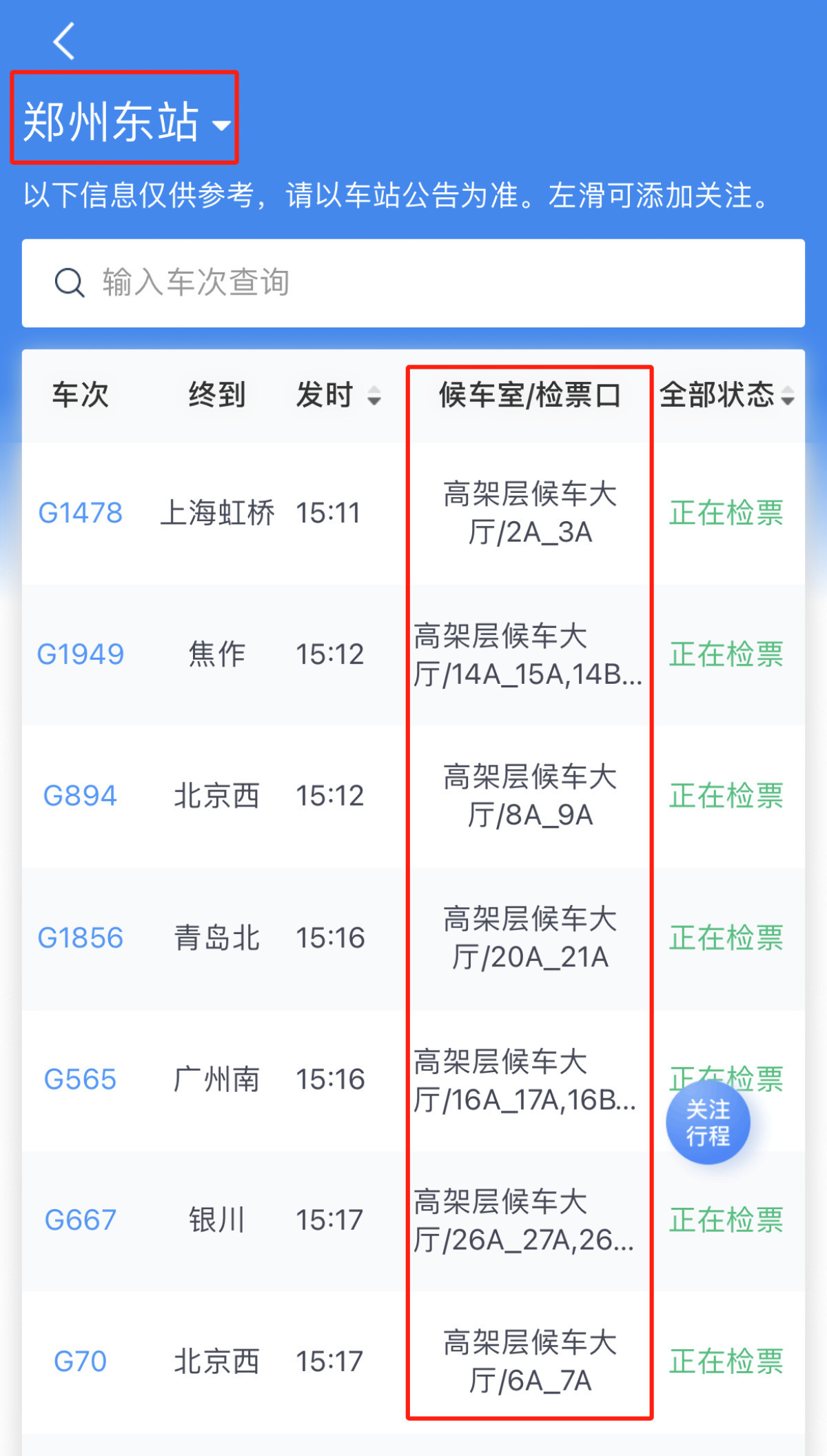 打开“车站大屏”在左上角选择“郑州东站”,此时,该车站从当前时间到24点以前所有出发列车的检票口等相关信息,都会在您的手机上显示出来。