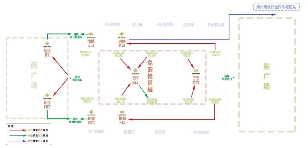 郑州东站作为地铁1号线和5号线的换乘站,旅客从不同的地铁出站口出站,那么前往高铁进站口的距离也会不同。