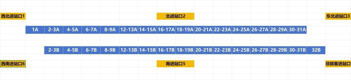 郑州东站候车厅内的检票口自西向东编号由1至32,其中靠北的检票口为A,靠南的检票口为B,具体分布如下: