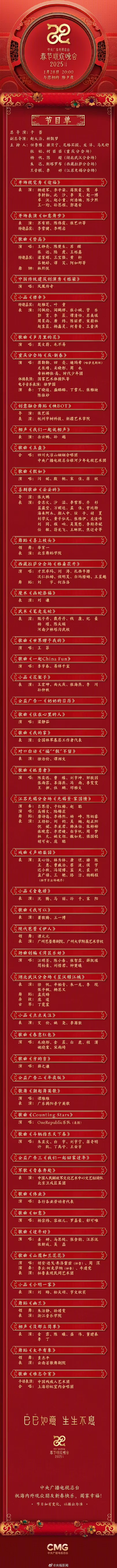 中央广播电视总台《2025年春节联欢晚会》节目单正式发布。在“欢乐吉祥、喜气洋洋”的主基调中,总台蛇年春晚以“巳巳如意,生生不息”为主题,汇聚歌曲、舞蹈、相声、小品、戏曲、武术、魔术等各类型节目,与全球受众共享年味,同庆新春!