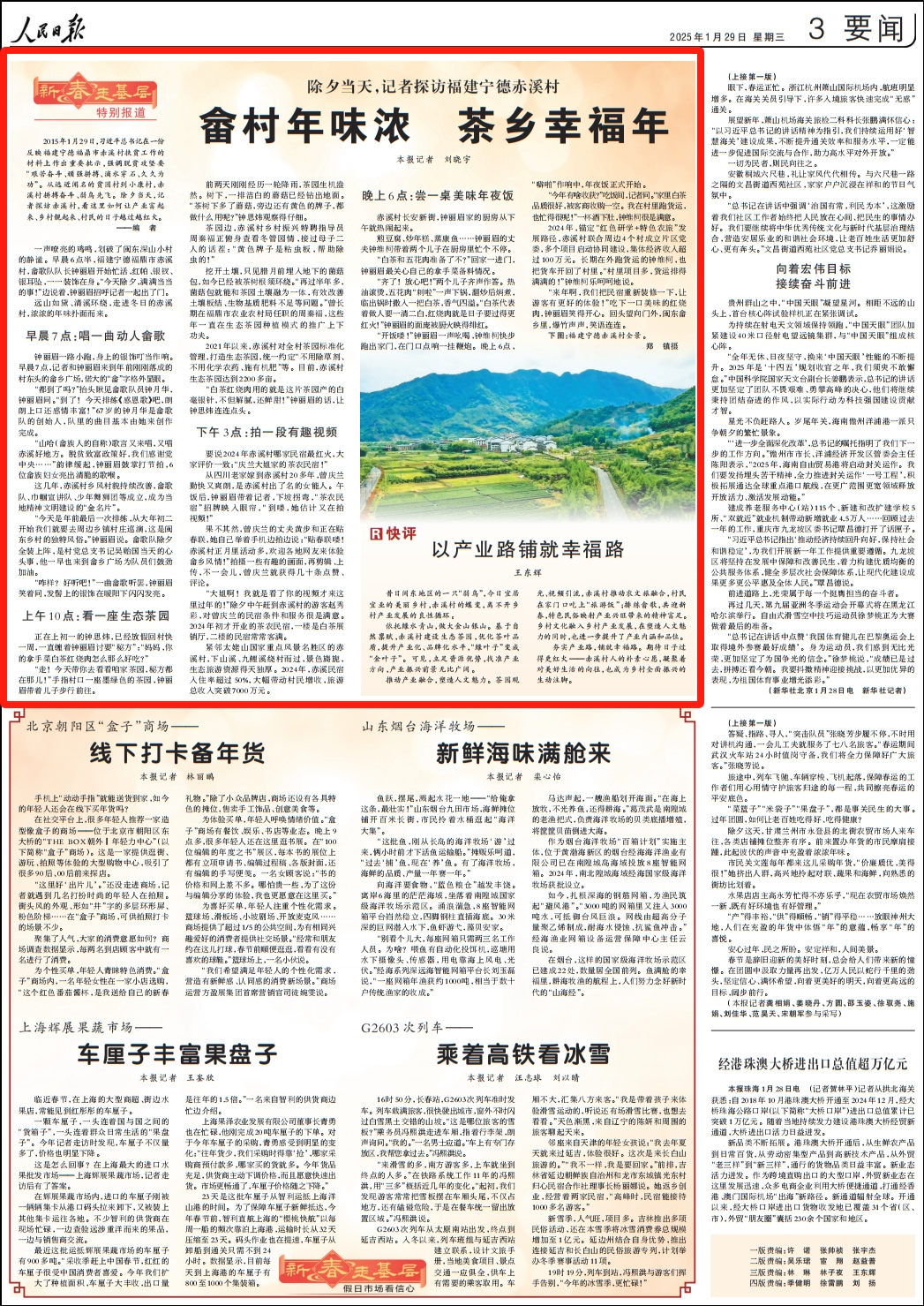 大年初一,人民日报要闻版“新春走基层”栏目刊发报道《畲村年味浓 茶乡幸福年》,聚焦福建宁德赤溪村,看这里如何牢记嘱托,让产业富起来、乡村靓起来、村民的日子越过越红火。