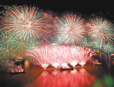 广东广州市白鹅潭春节烟花汇演在珠江畔上演。 |