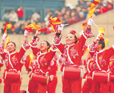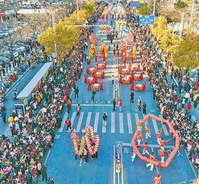 江苏海安市举行“龙腾狮跃贺新春”巡游展演活动,文化志愿者表演传统民俗节目。 |
