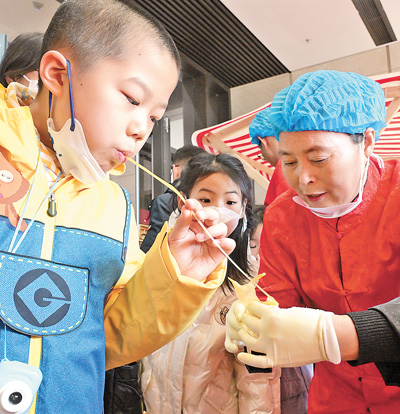 北京中国非物质文化遗产馆,小朋友在“过年——春节主题展”上体验吹糖人。 |