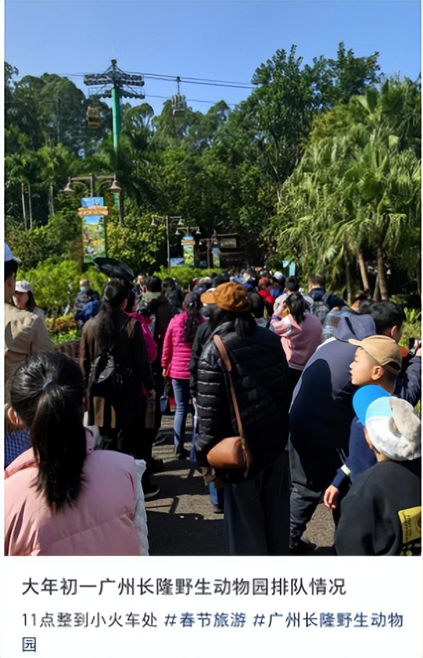 初一早8时许,广州长隆门外就已经开始排队,据网友在社交平台发帖表示,“还没到开门时间,门口已排起长队。”“进入园区后小火车也要排队。”