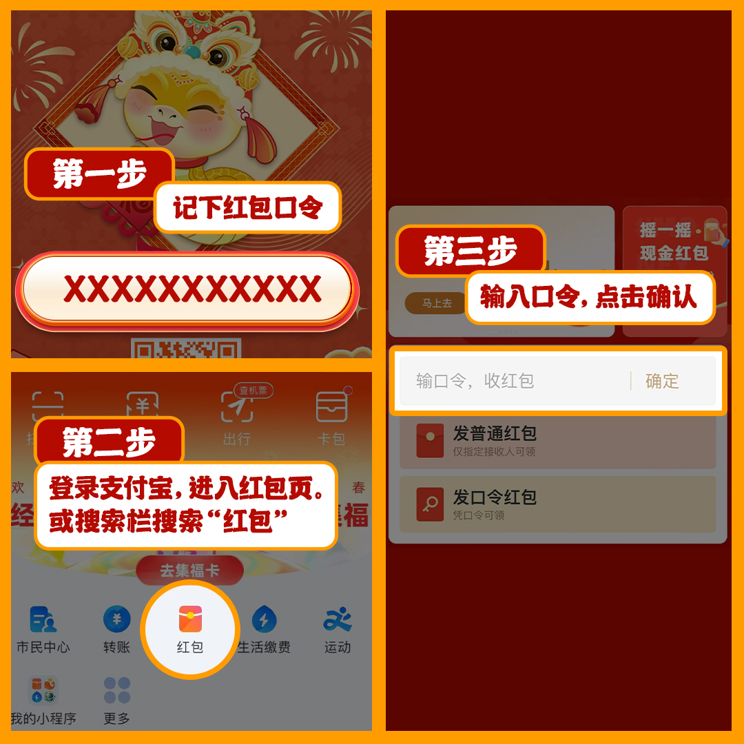第二步,记住所发图片中显示的红包口令,请登录支付宝—→点击或搜索“红包”—→输入口令,点击“确认”就可以抢红包了。